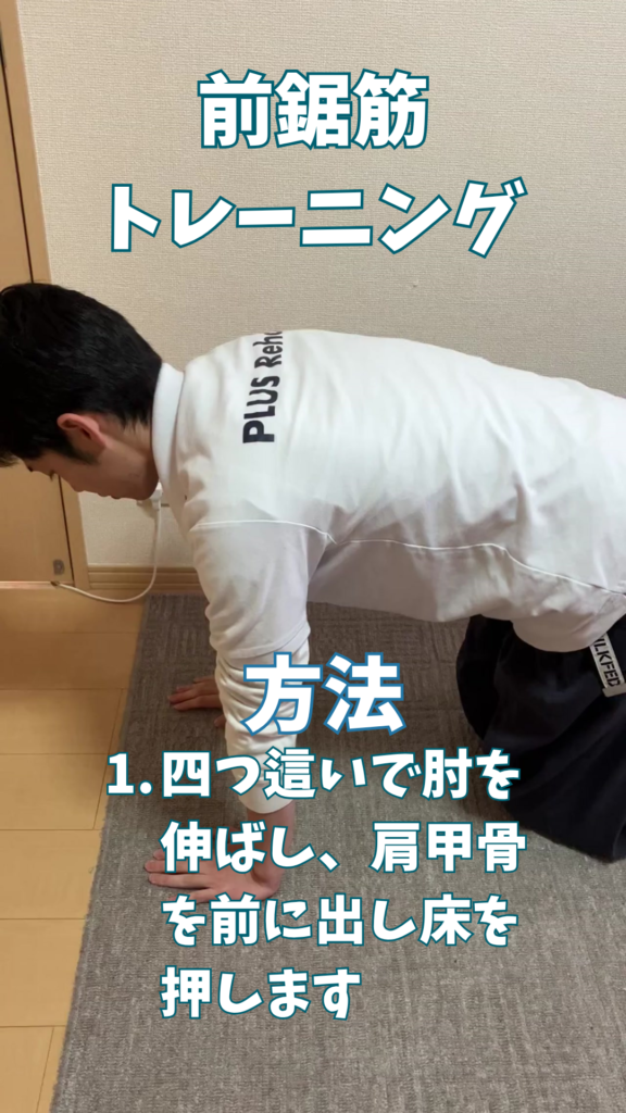 - 四つ這いで肘を伸ばし、肩甲骨を前に出し床を押します