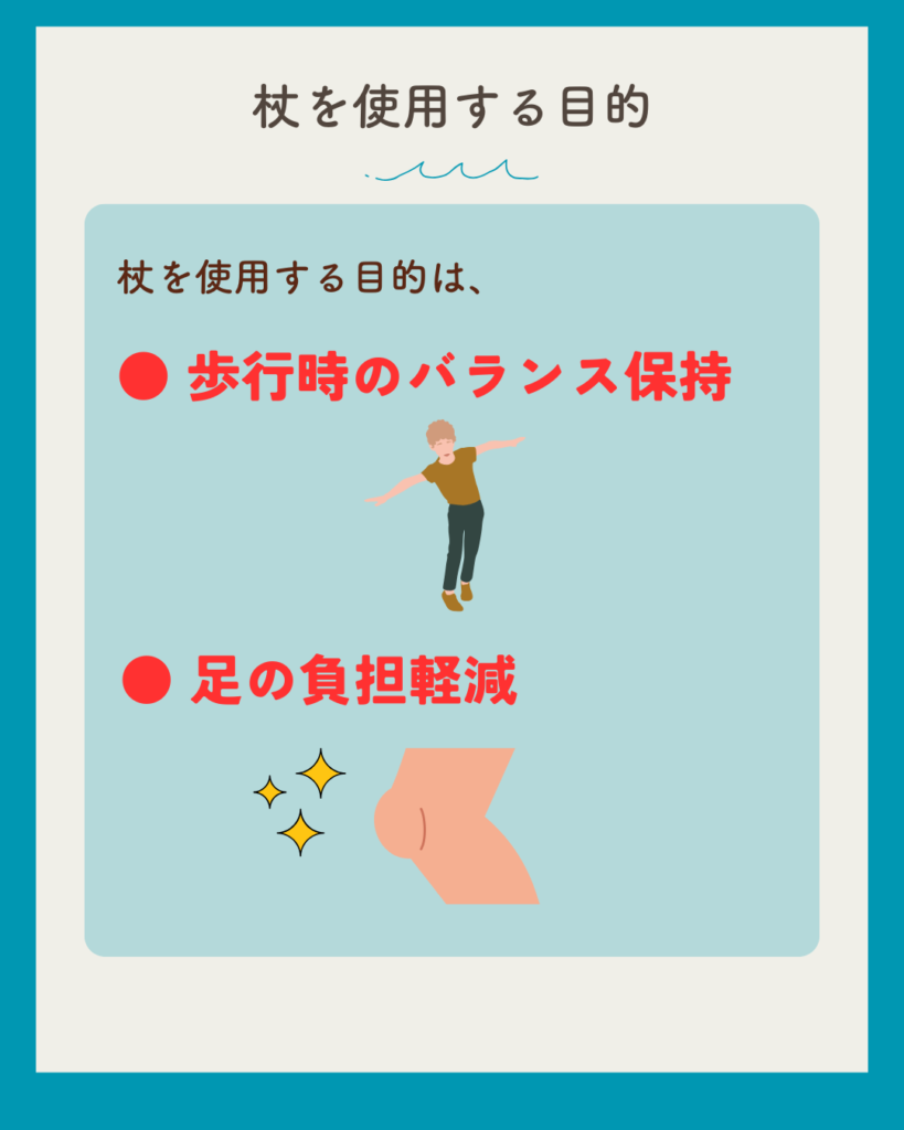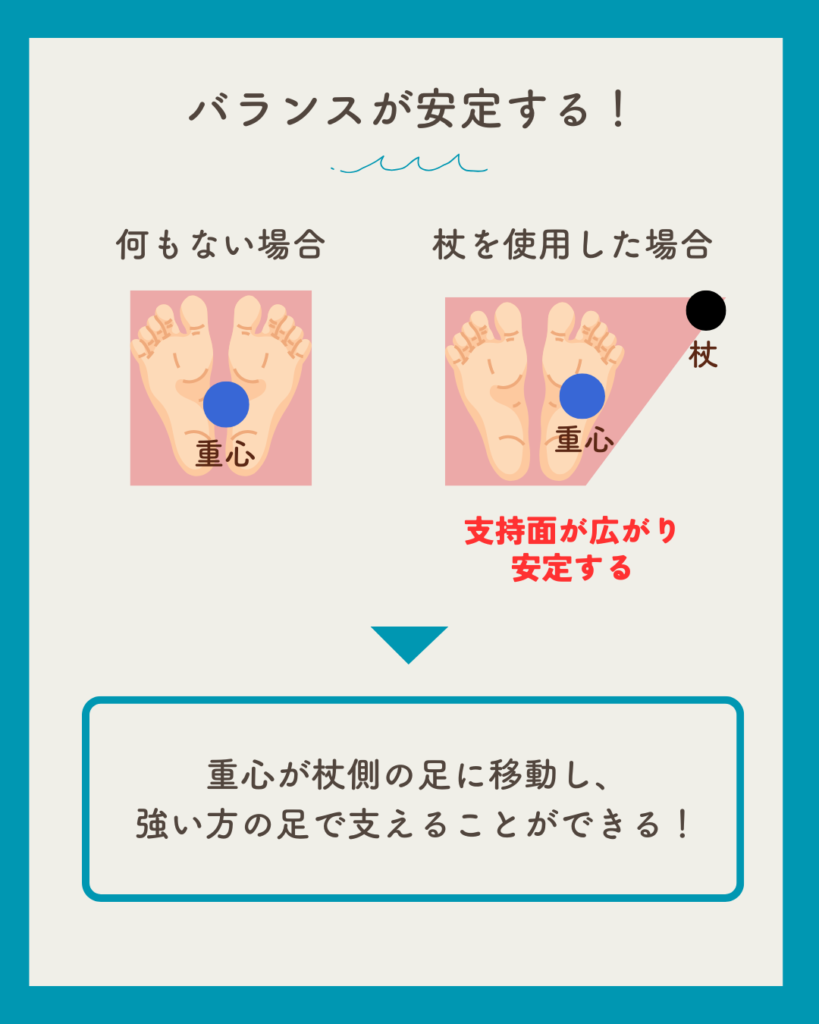 また、重心が杖側の足に移動し、強い方の足で支えることができるため、バランスがとりやすくなります。