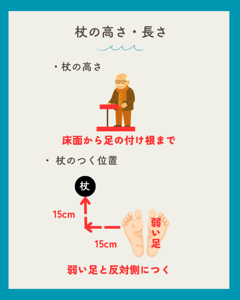 杖は弱い足の反対側の手で持ち、15cm横、15cm前につきます(長さは適当で大丈夫です)。