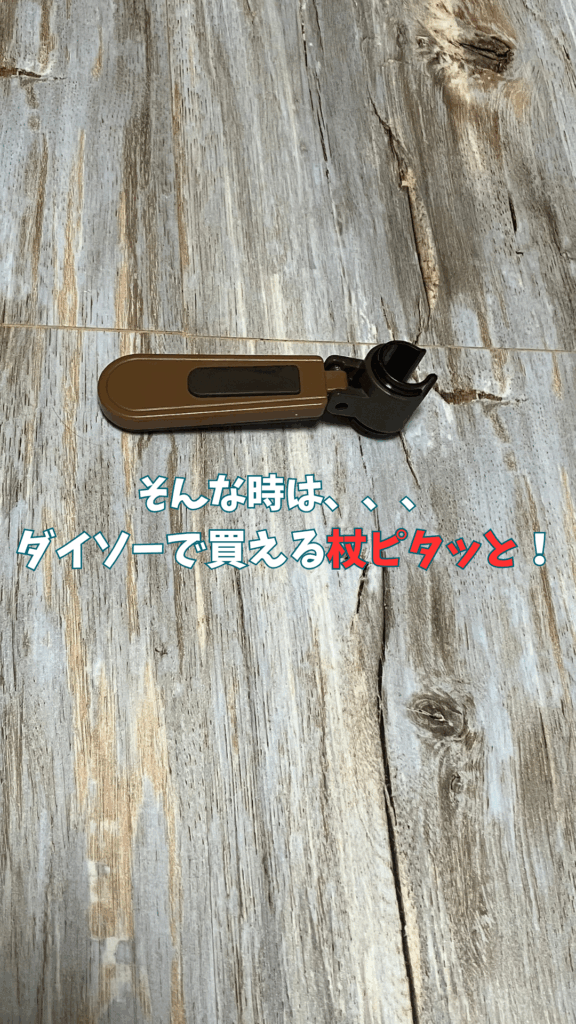 ダイソーなど100均にも売っている杖ピタッとを杖に装着することで、幅をとらずに杖が倒れる心配ありません!