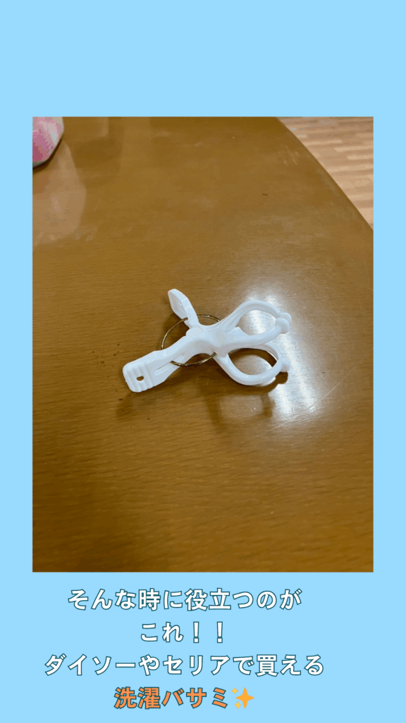 洗濯バサミを棒状のところに挟み、外側の部分を使用し、杖を置くことで倒れる心配がなくなります。