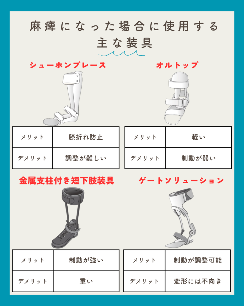 麻痺になった場合に使用する主な装具